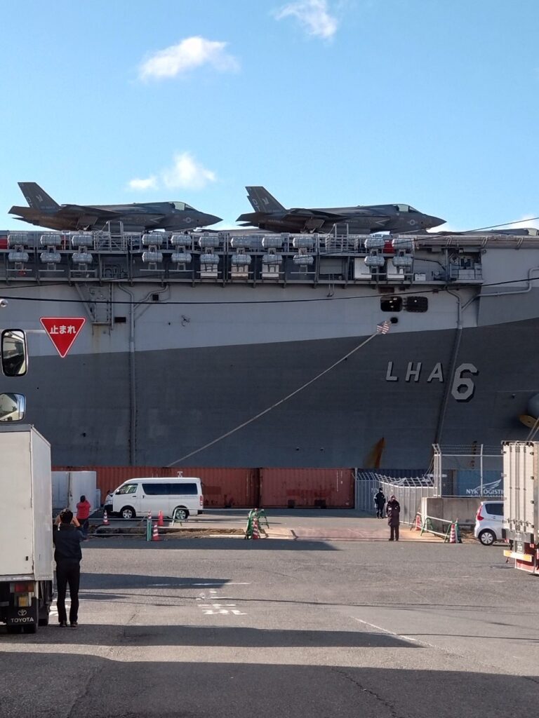 バスは、艦船の横をあっという間に通り過ぎてしまい、なんで降車して、ゆっくり見なかったんだと後悔しました。興奮冷めやらぬ中、バスの中で艦船側面の英数字を手掛かりに調べてみると日米共同軍事演習の為に、大阪港に寄港した米海軍第7艦隊の強襲揚陸艦『アメリカ』とのことでした。強襲揚陸艦とは上陸作戦を前提に戦闘機やヘリコプターを搭載したほぼ空母のような艦船だそうで、排水量45,000トン、全長257メートル、可能乗員数は約2,800名とのことでした。 同艦は数時間前に、報道陣に艦内の取材を終えたばかりで、その様子が既にYouTubeにアップされていました。甲板上の戦闘機はF35ステルス戦闘機で垂直離発着も出来るということでした。